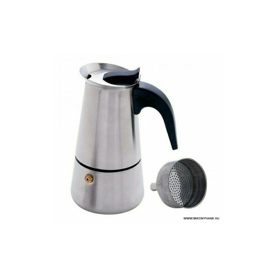 Klasszikus kotyogós rozsdamentes kávéfőző műanyag fekete nyéllel, ami nem veszi át a hőt. 6 csésze kávé elkészítésére alkalmas egy időben.