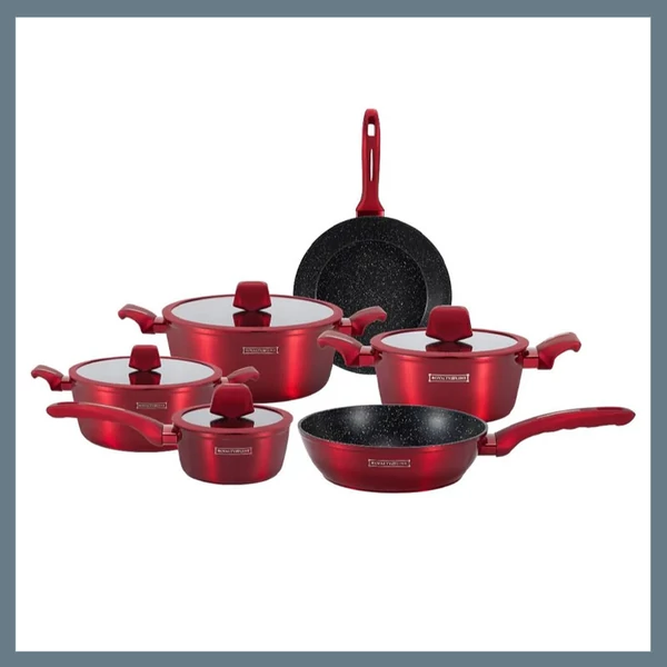 A Royalty Line T10Red 10 részes edénykészlet modern megjelenésével és kiváló minőségű anyaghasználatával ideális választás minden konyhába. A márvány bevonat biztosítja az ételek letapadásmentes elkészítését, míg a szilikon fogantyúk kényelmes és biztonságos használatot garantálnak. Az edénykészlet indukciós főzőlapokon is használható, így univerzálisan alkalmazható.