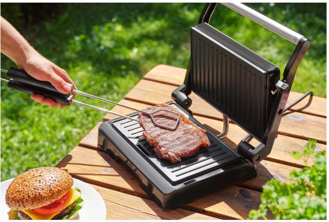 A rendkívül stílusos megjelenésű kontaktgrill igencsak jól mutat a konyhapulton (persze függőleges tárolási pozíciójának köszönhetően igény szerint egyszerűen el is rakhatja a konyhaszekrénybe).