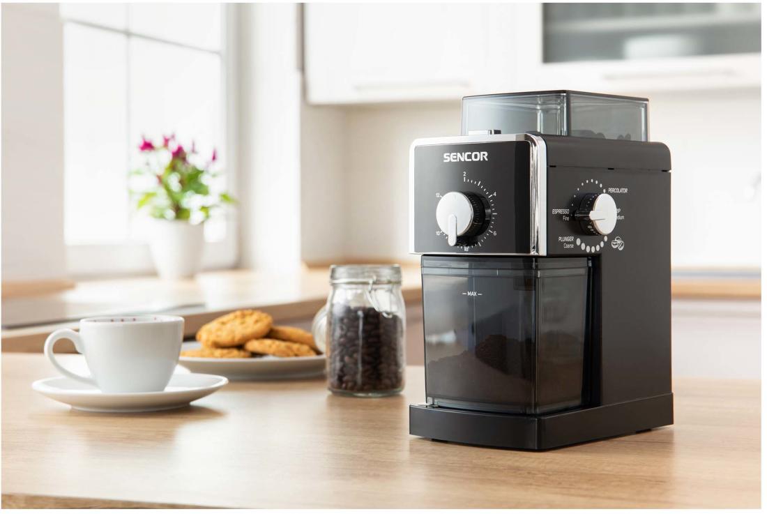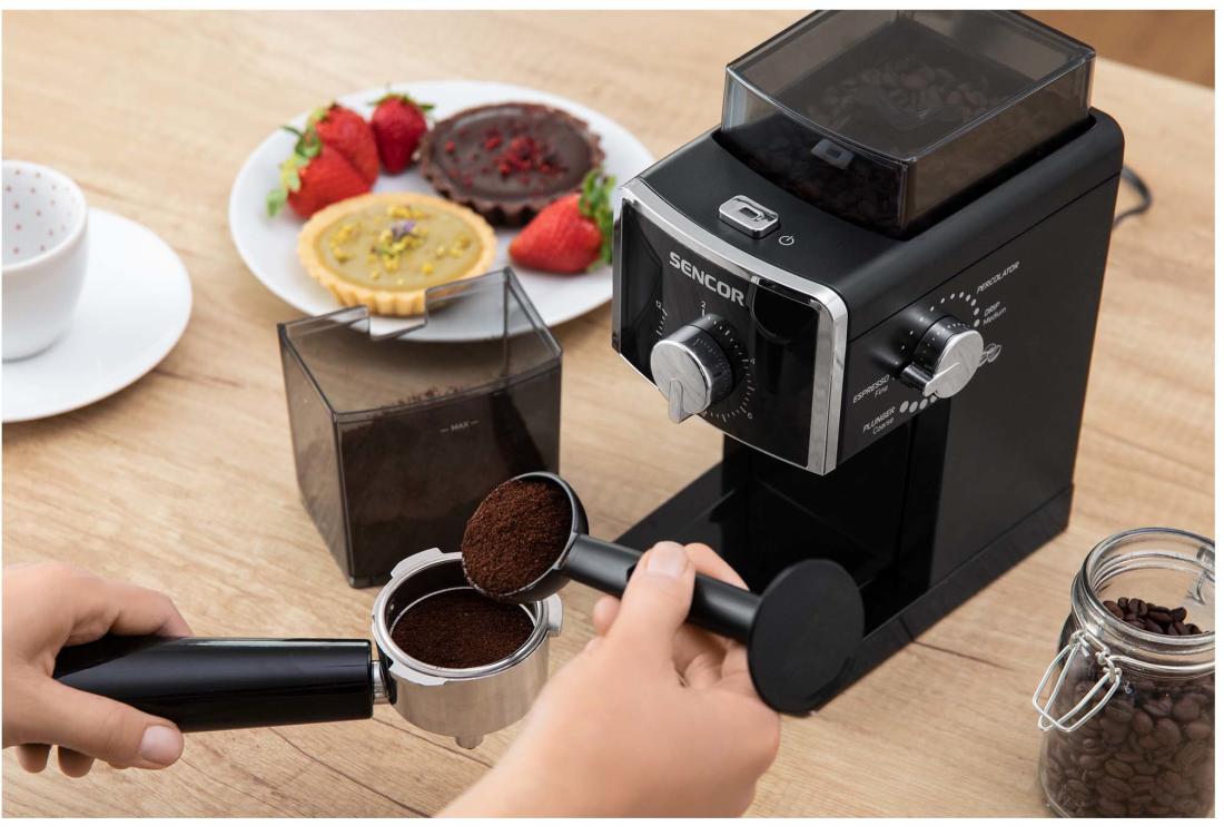 A rozsdamentes acél kialakítás hosszú élettartamot és könnyű karbantartást garantál. A Sencor alaptartozékokkal szerelte fel a kávédarálót, többek között egy nagy kávébab tartály, amely akár 180 g szemes kávé tárolását teszi lehetővé. Az edényhez tartozó speciális tömítéssel rendelkező fedő, tökéletesen zár, így nem párolog ki az aroma a szemekből. Az őrölt kávét automatikusan egy nagy kapacitású alsó tartályba kerül. Így Önnek csak egy mérőpohárra van szüksége, aminek köszönhetően meghatározhatja a szokásos őrölt kávé adagot egy vagy több csészére.