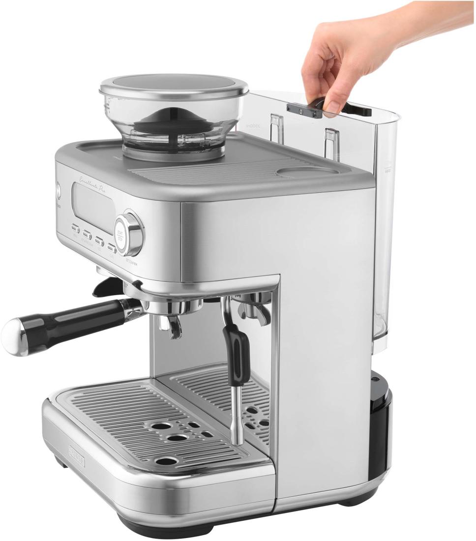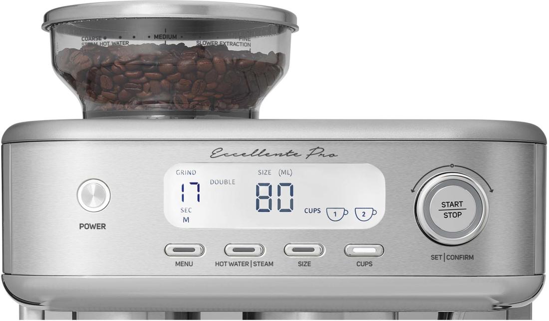 A beépített fehér háttérvilágítású LCD kijelző segítségére lesz a különböző programok személyre szabásában, valamint a főzési folyamat ellenőrzésére. Az aromazáró fedéllel ellátott kávétartály akár 250 g szemes kávé tárolására alkalmas, állag romlás nélkül. Meg kell még említeni a víztartályt, amely természetesen el lett látva vízszintjelzővel, és a maximális kapacitása 2,3 liter.