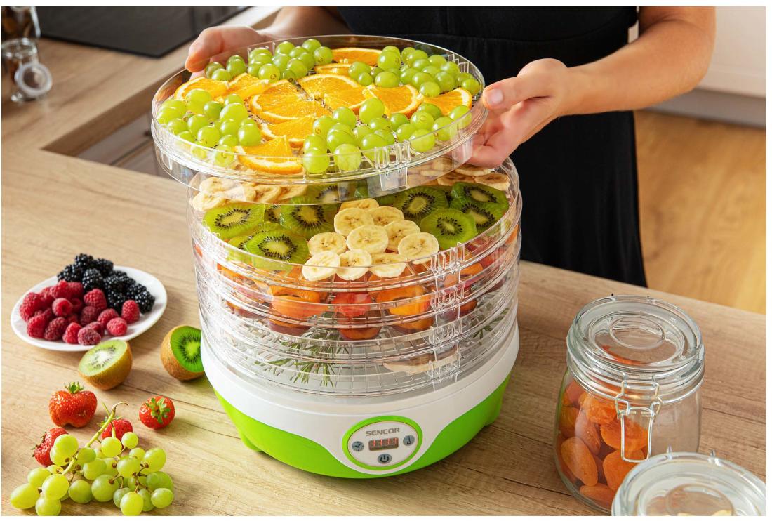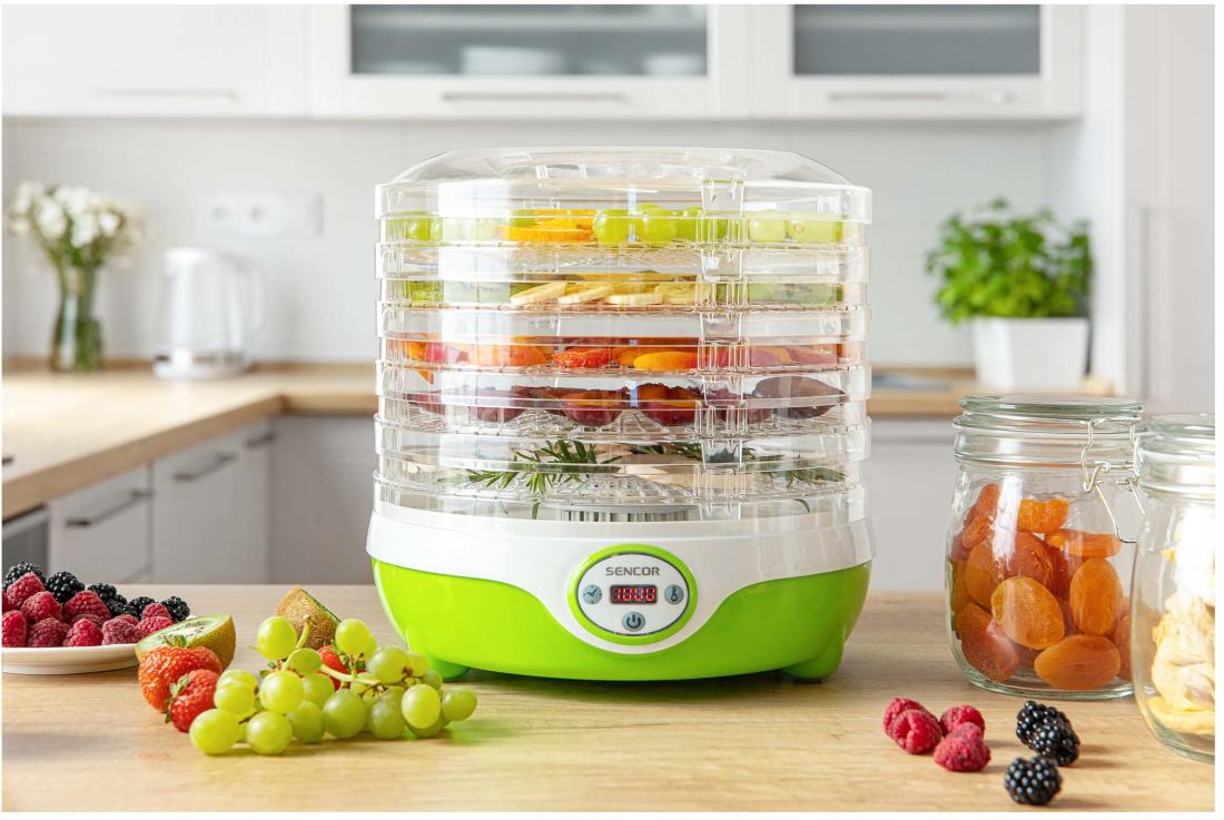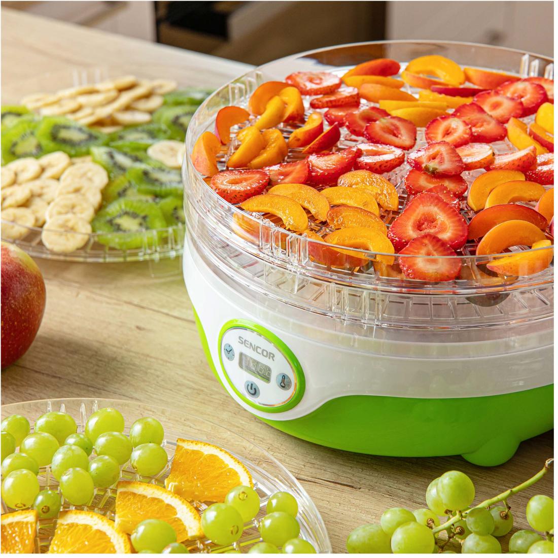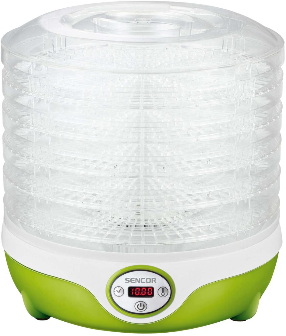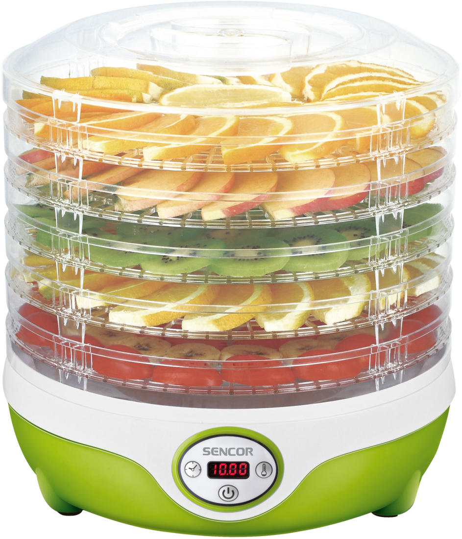A Sencor SFD 851GR aszaló 5 db szárító tálcával rendelkezik. A tálcák 255 mm átmérővel rendelkeznek és a szárítási szintek manuálisan állíthatók. Segítségével különböző aszalt gyümölcsöket, gyógynövényeket, gombákat, húsokat vagy akár halakat száríthatunk. Manuálisan állítható hőfokszabályzás 35–70°C között. A beépített ventilátor gondoskodik az egyenletes szárításról mindegyik szinten, a szárító sziták rácsának kialakítása pedig megakadályozza a penész keletkezését és optimalizálja a légáramlást. Az átlátszó borítás lehetővé teszi a szárítási folyamat teljeskörű ellenőrzését, valamint a LED kijelző a várható befejezési időt olvashatjuk le.