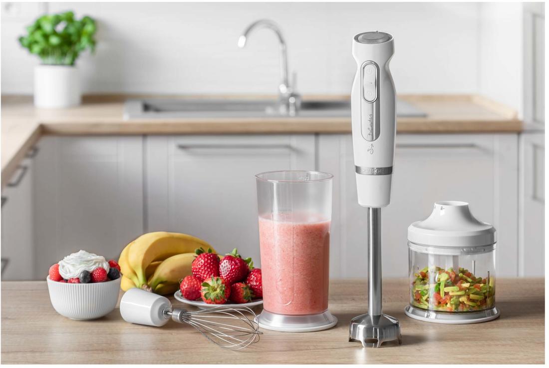 | Csomag tartalma | 700 ml-es mixelő edény fedéllel • 500 ml-es aprító edény, rozsdamentes késsel és fedéllel • Rozsdamentes habverő • Rozsdamentes rúdmixer |