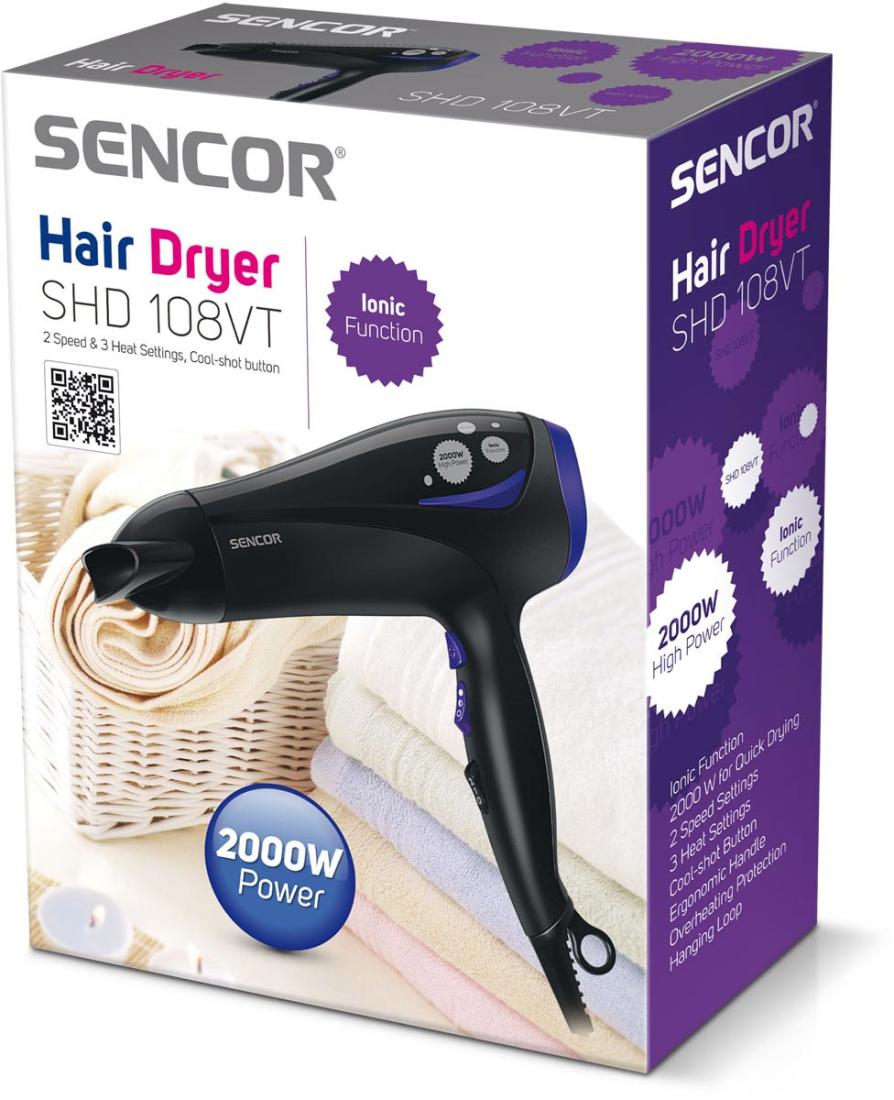 A Sencor SHD 108VT hajszárítóval könnyedén készíthet el különböző stílusú frizurákat. Három szárítási fokozattal – egy gyengédebbel, egy intenzívebbel és egy erős– rendelkezik, továbbá egy kapcsolóval a hideg levegő fújására, amely hasznos hajfixáláskor és stylingoláshoz. Így igényeinek megfelelően választhat közülük. Ergonomikusan kialakított fogantyú a kezelőelemek optimális elosztásával a jobb- és balkezesek részére egyaránt. A hajszárító működéséről egy halk DC motor gondoskodik, amelynek teljesítménye 2200 W. Ionizációs védelemmel rendelkezik, amely megvédi a hajat a károsodásoktól.