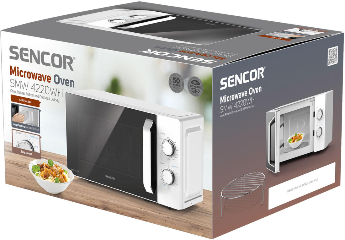 A Sencor SMW 4220WH egy letisztult, mégis elegáns megjelenésű, szabadon álló mikrohullámú sütő. Az akár 700 W mikrohullámú- és 1.000 W grill teljesítményre képes készülék, amely manuális vezérlésű. A 20 literes kapacitás mellett öt különböző fokozattal lett felszerelve, továbbá elérhető a kiolvasztási funkció, valamint beépítésre került egy maximum 35 perces időzítő. A kezelése és tisztán tartása könnyen és egyszerűen elvégezhető. A forgótányér 255 mm átmérővel rendelkezik.