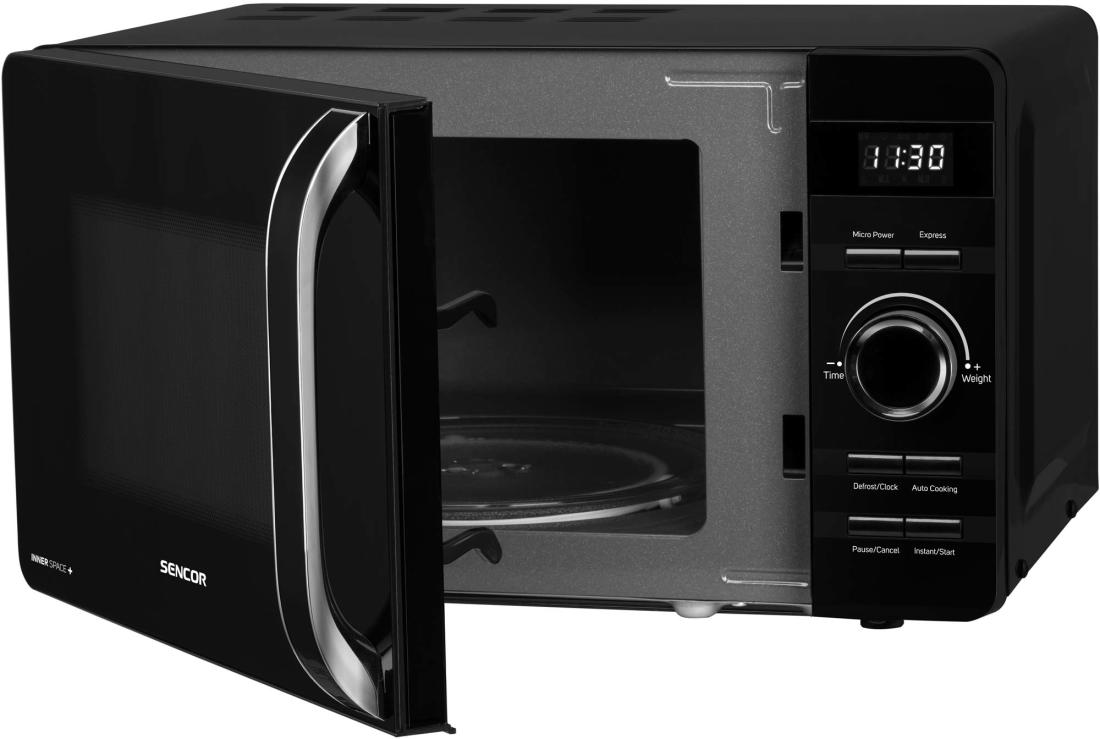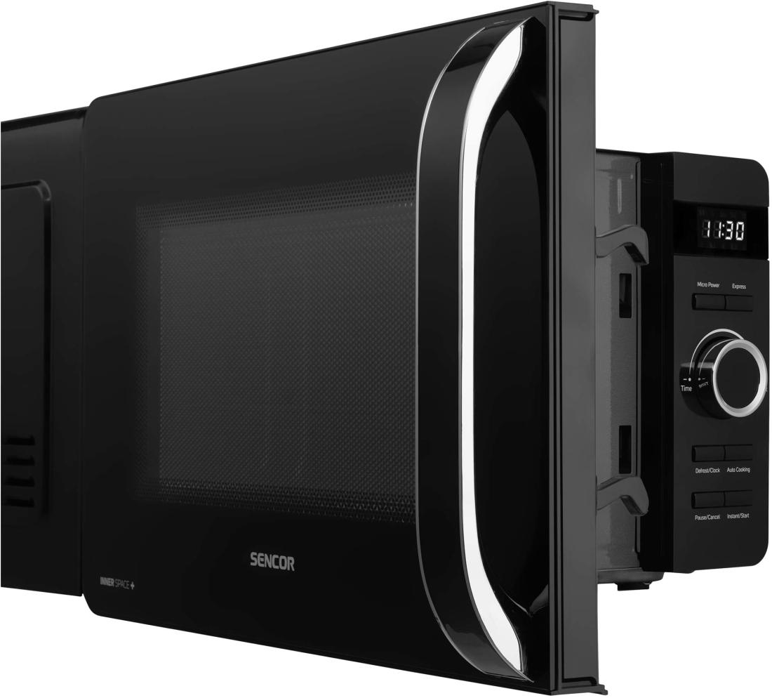 Az ajtóra rögzített nyitó kar segítségével, egyszerűen kinyitható a Sencor mikrohullámú sütő ajtaja. Az oldalra nyíló ajtó kialakításnak köszönhetően hatékonyabban tudja használni szinte minden helyzetben. A szabadonálló kialakításnak köszönhetően a készülék elhelyezése szinte határtalan.