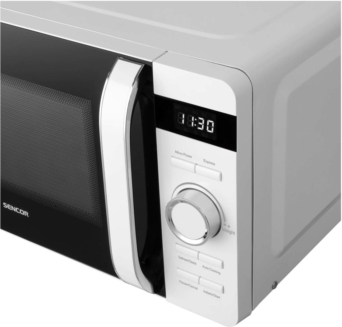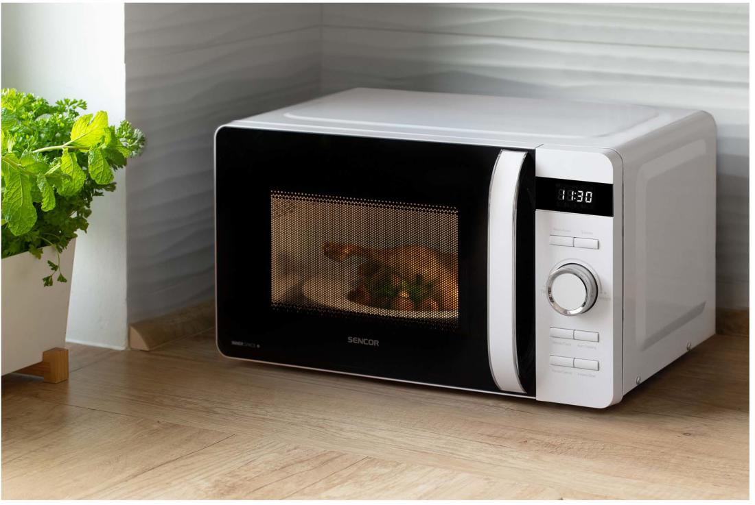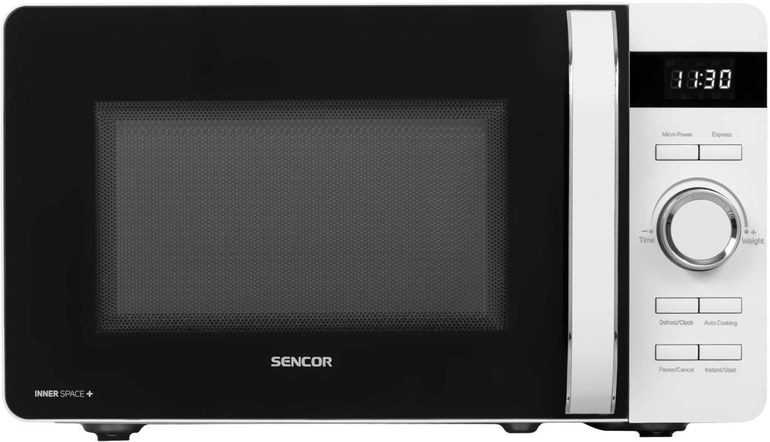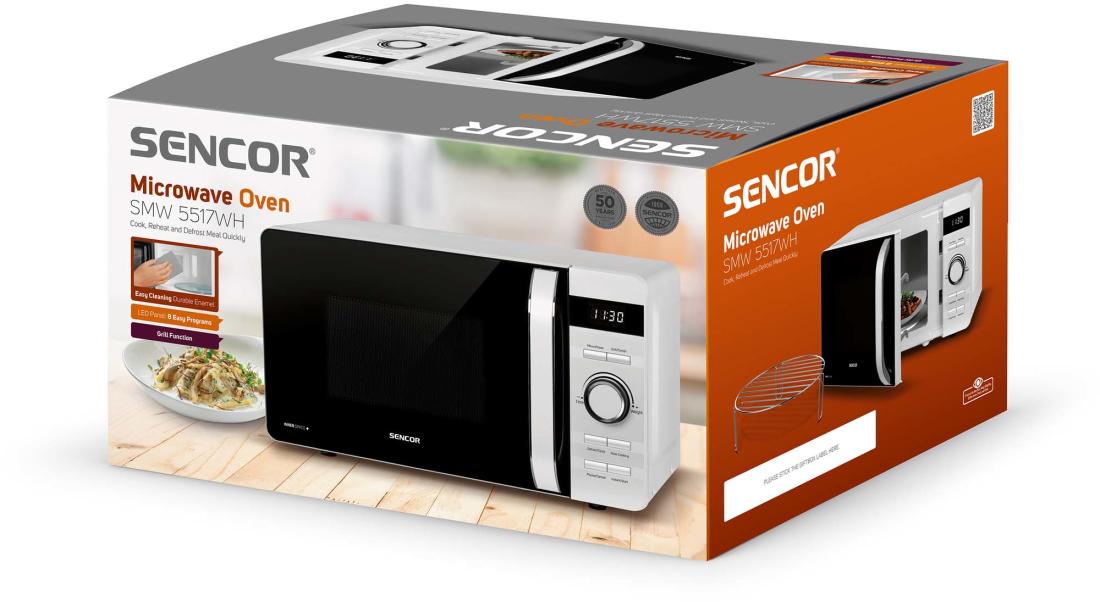 A Sencor SMW 5517WH mikrohullámú sütő nemcsak az ételek melegítésében segít, hanem kiolvasztási, grillezési és főzési funkciókat is kínál. A sütő belső térfogata 17 liter, a forgó üvegtányér pedig 27 cm átmérővel rendelkezik. A mikrohullámú sütő 5 teljesítményszinttel felszerelt. 3 leolvasztási programot kínál az étel típusának megfelelően, és 3 grillezési program közül választhat. A fő vezérlőpanelen 8 előre beállított program közül választhat. A mikrohullámú sütő 60 perces időzítővel is rendelkezik, amely széles időtartománnyal rendelkezik.