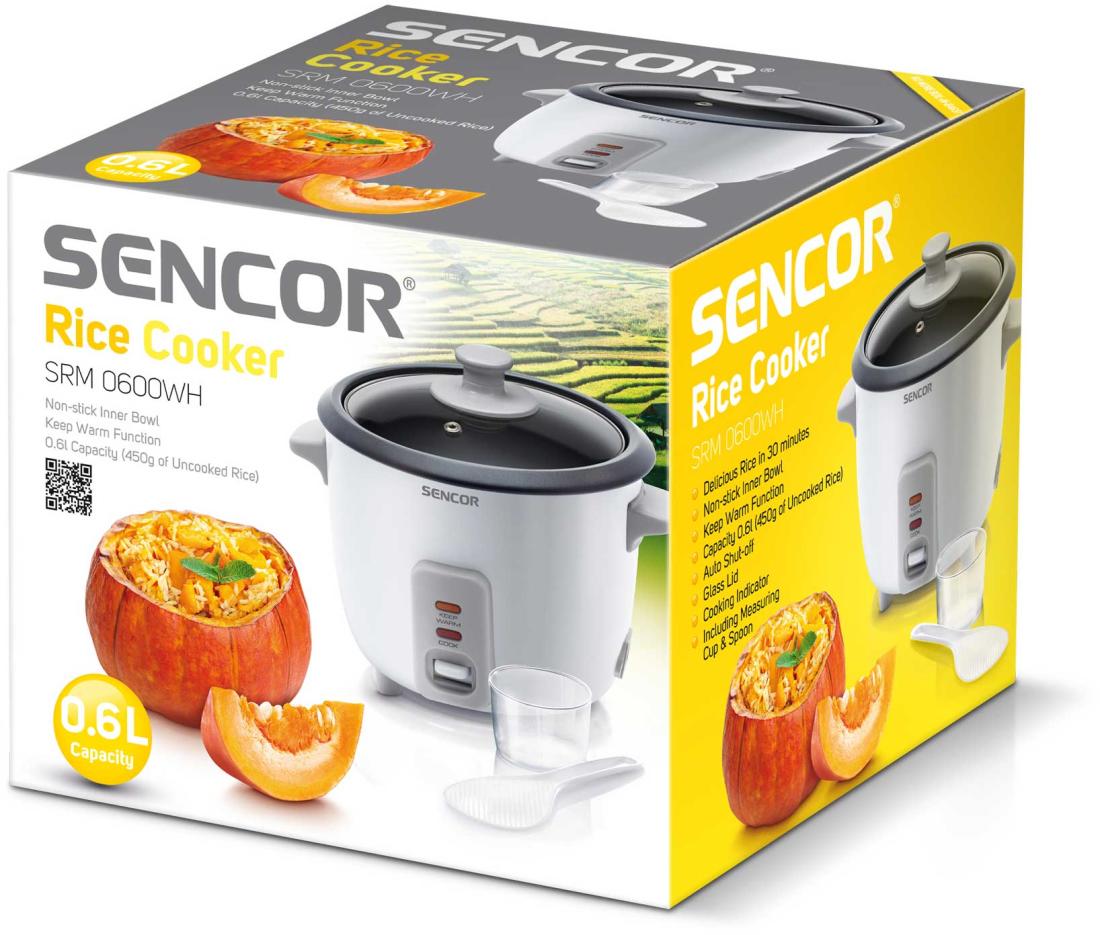A Sencor SRM 0600WH egy speciális elektromos főzőedény rizs készítésére. Bármilyen típusú rizs elkészítésére kiválóan alkalmas a normál fehér rizstől, a különleges sushi rizsig. A készülék a gőz segítségével készíti el a rizst, a készülék tetején kialakított nyíláson távozik a felesleges mennyiségű pára. A rizsfőző akár 300 W teljesítményt is elérheti, az kapacitása pedig 0,6 liter, amely kb. 450 g rizs elkészítésére alkalmas. A speciális belső kialakításnak köszönhetően az étel nem tapad le, így könnyen és egyszerűen kivehető és tisztítható. A rizsfőző folyamat végeztével a készülék automatikusan egy melegen tartó üzemmódba kapcsol, mellyel akár 6 órán keresztül is melegen tartható az elkészült rizs.