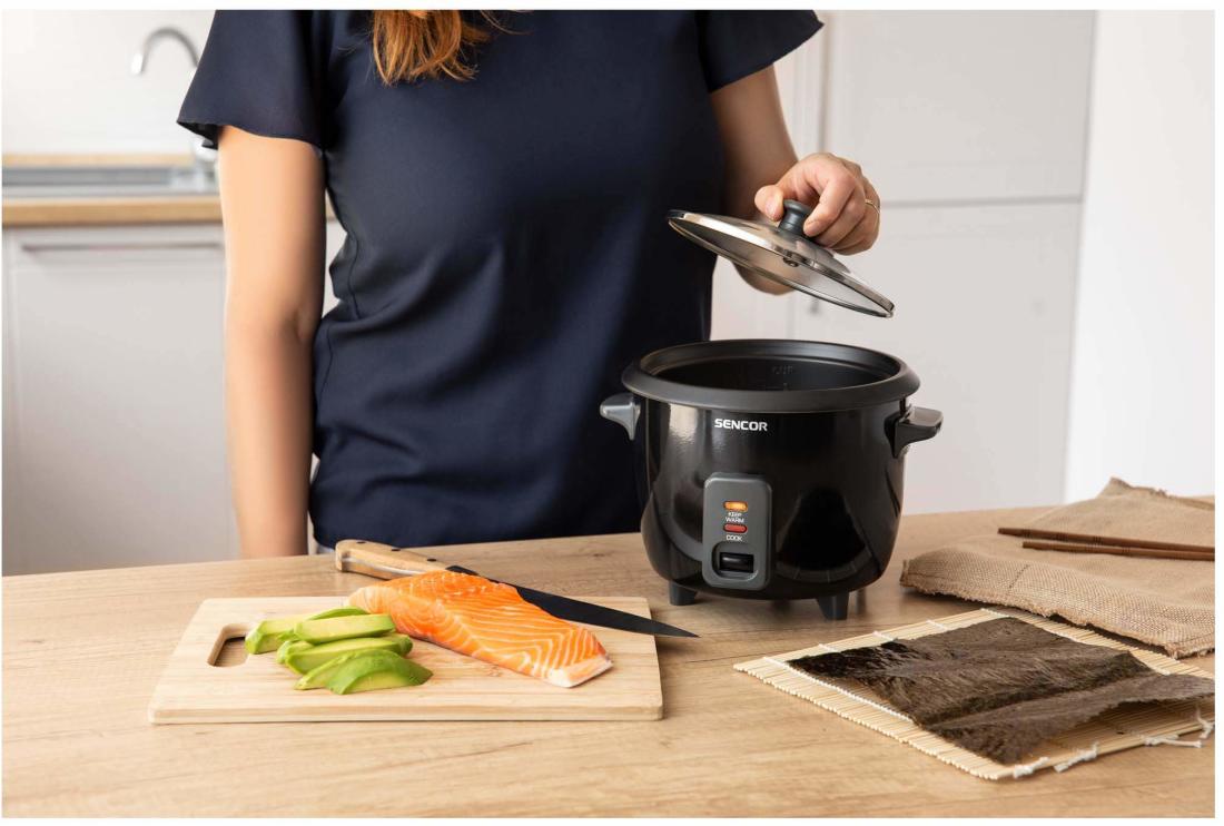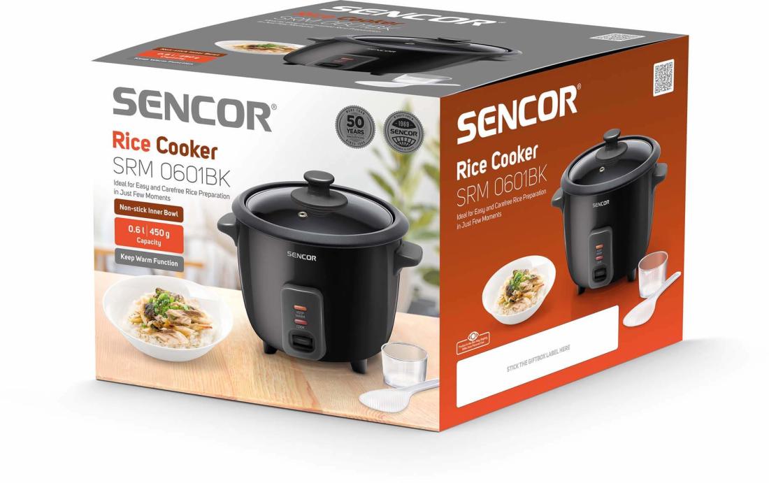 A Sencor SRM 0601BK egy speciális elektromos főzőedény rizs készítésére. Bármilyen típusú rizs elkészítésére kiválóan alkalmas a normál fehér rizstől, a különleges sushi rizsig. A készülék a gőz segítségével készíti el a rizst, a készülék tetején kialakított nyíláson távozik a felesleges mennyiségű pára. A rizsfőző akár 300 W teljesítményt is elérheti, az kapacitása pedig 0,6 liter, amely kb. 450 g rizs elkészítésére alkalmas. A speciális belső kialakításnak köszönhetően az étel nem tapad le, így könnyen és egyszerűen kivehető és tisztítható. A rizsfőző folyamat végeztével a készülék automatikusan egy melegen tartó üzemmódba kapcsol, mellyel akár 6 órán keresztül is melegen tartható az elkészült rizs.