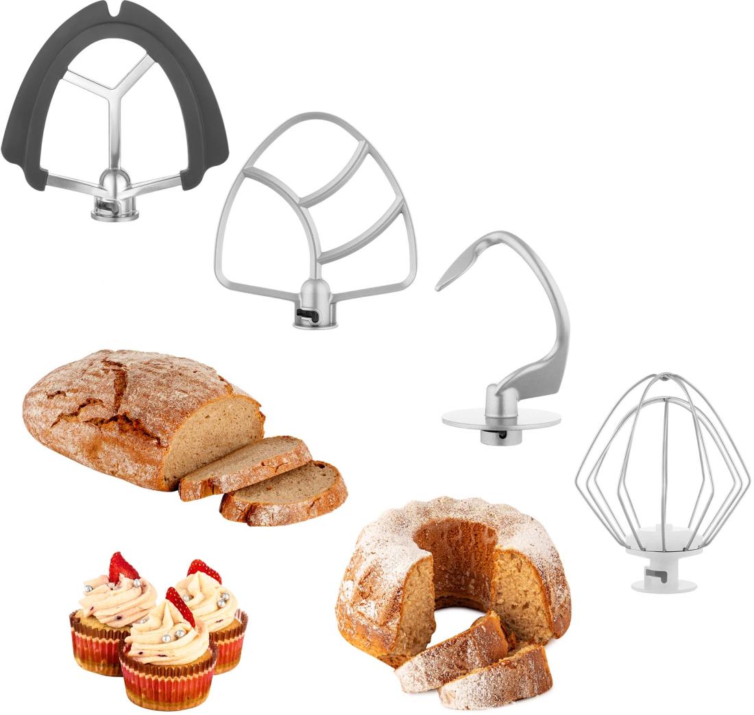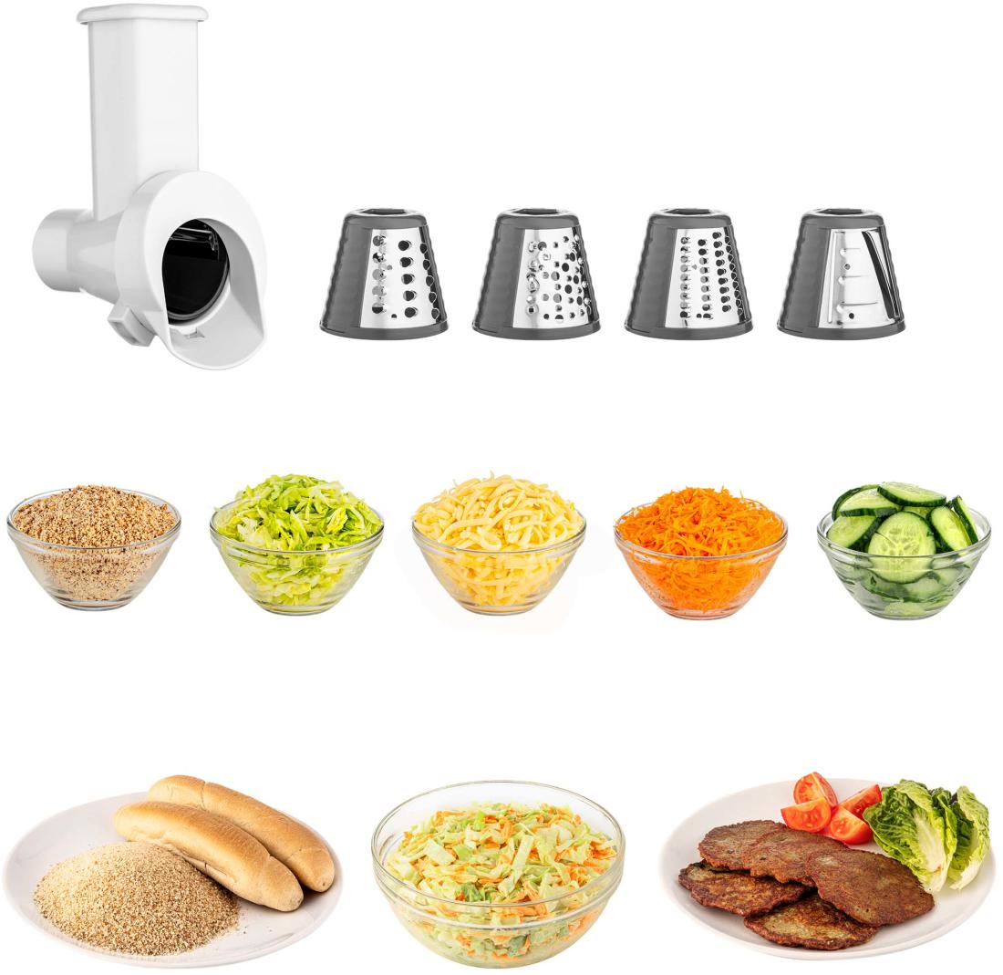 | Tartozékok | 4,5 l-es rozsdamentes acéledény, térfogat skálával • 1,5 l-es üvegkehely • Átlátszó fedél adagoló nyílással, az alapanyagok a keverés közben is adagolhatók • Műanyag edényfedél a tároláshoz • Húsdaráló, finom és durva daráláshoz • 5 darab cserélhető szeletelő - Vékony / Hullámos / Durva / Finom / nagyon • 3 keverőszár: dagasztószár, A-alakú keverő, ballon alakú habverő • Speciális FLEXI keverő a finom tésztákhoz és krémekhez • Kolbásztöltő – 2 átmérő • Daráltkeksz készítő |