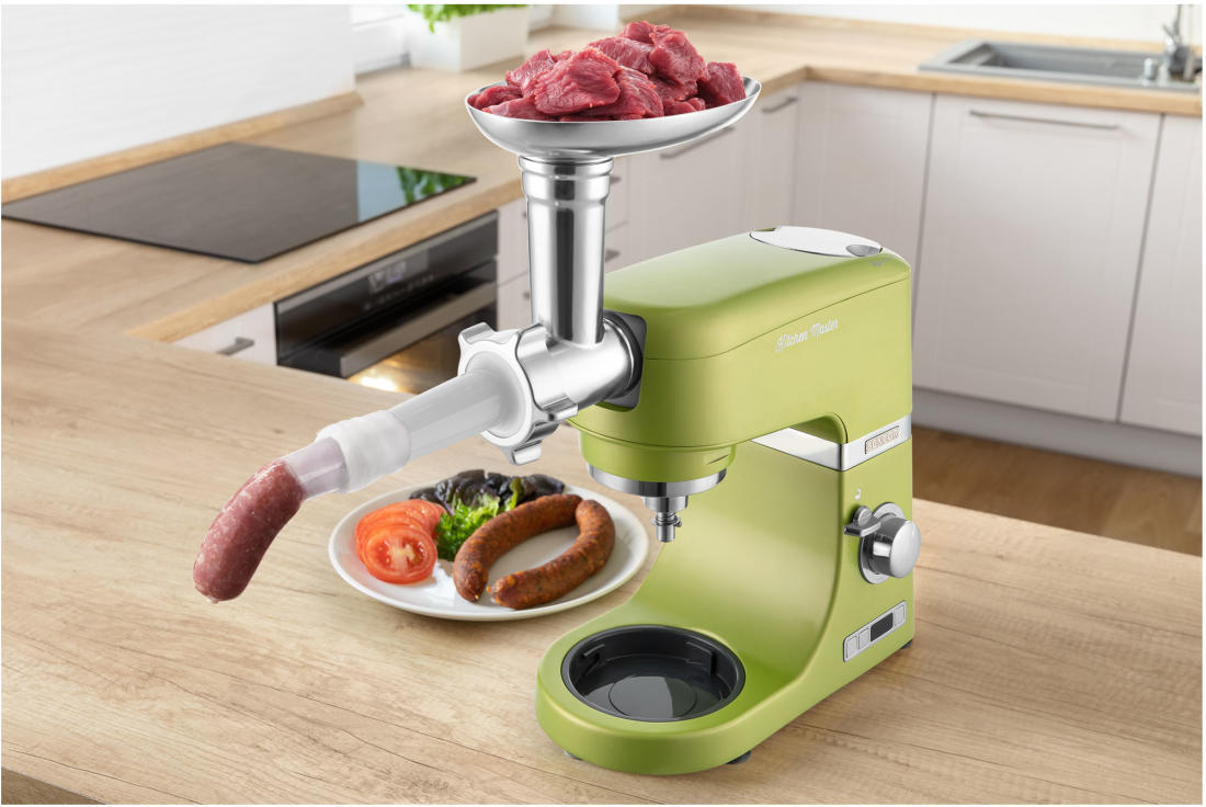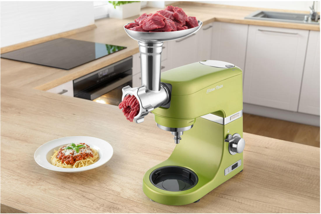 | Tartozékok | 4,5 l-es rozsdamentes acéledény, térfogat skálával • 3 l-es rozsdamentes acéledény, térfogat skálával • 1,5 l-es mixer kehely, TRITAN-ból készül BPA mentes • Átlátszó fedél adagoló nyílással, az alapanyagok a keverés közben is adagolhatók • Műanyag edényfedél a tároláshoz • Húsdaráló, finom és durva daráláshoz • 3 keverőszár: dagasztószár, A-alakú keverő, ballon alakú habverő • Speciális FLEXI keverő a finom tésztákhoz és krémekhez • Kolbásztöltő • Daráltkeksz készítő |