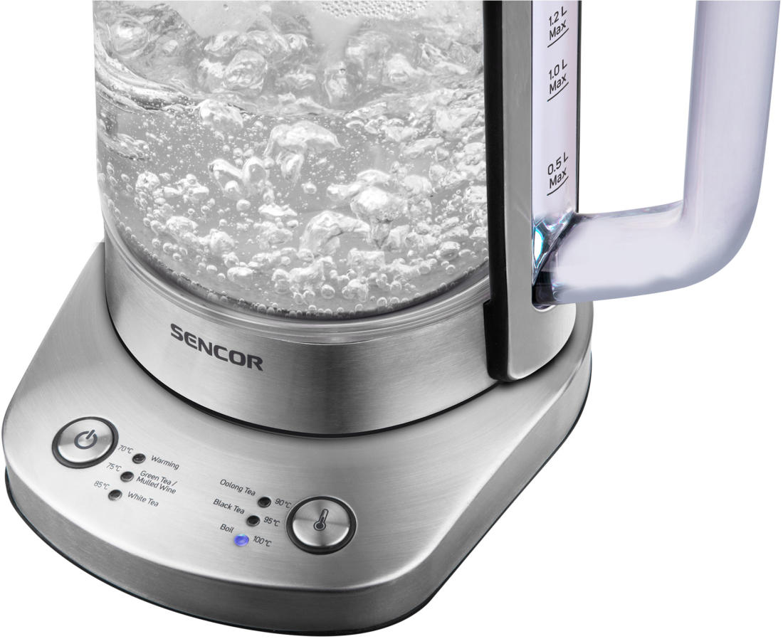 A Sencor SWK 1590SS stílusos okos vízforraló kiváló ötvözete az eleganciának és a praktikusságnak. A maximális kapacitása 1,5 liter és az anyagát tekintve kiváló minőségű tűzálló bór-szilikát üveg és rozsdamentes acél. A vízforraló 1500 W teljesítményének köszönhetően gyorsan felmelegíti a vizet. A tökéletes ízélmény elérését az elektronikus hőmérséklet-szabályozó (70–100 °C) segíti. A kivehető filter teák és gyógynövények áztatásához nélkülözhetetlen kiegészítő. Az elkészült forró ital még sokáig meleg marad, köszönhetően a hőmérsékleten tartó funkciónak.