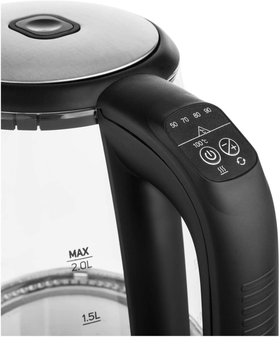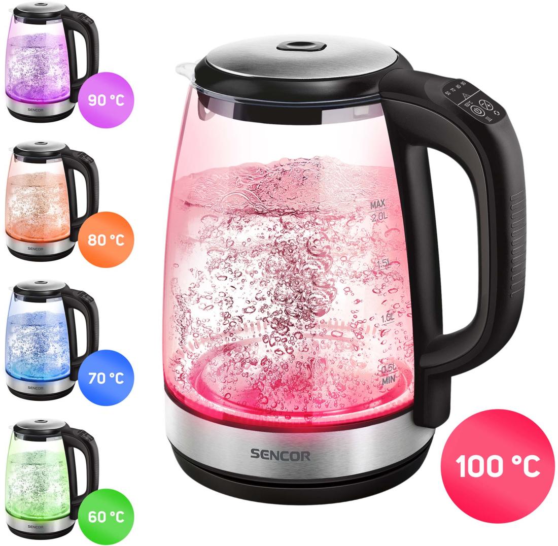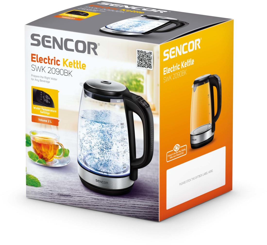 A Sencor SWK 2090BK stílusos és praktikus elektromos üveg vízforraló. A maximális kapacitása 2,0 liter és az anyagát tekintve kiváló minőségű üveg nemesacél kombináció vízszintjelző skálával. A vízforraló 2200 W teljesítményének köszönhetően gyorsan felmelegíti a vizet. A tökéletes ízélmény elérését az elektronikus hőmérséklet-szabályozó (50–100 °C) segíti. Az elkészült forró ital még 30 percen keresztül meleg marad, köszönhetően a hőmérsékleten tartó funkciónak. A hármas biztonsági rendszernek köszönhetően a vízforraló védve van a túlmelegedés ellen víz nélküli bekapcsolás esetén, ugyanígy automatikusan kikapcsol, ha levesszük a talpról, valamint ha eléri a forráspontot.