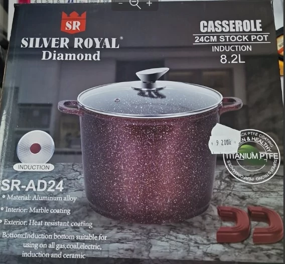 A Silver Royal Diamond SR-AD24 fazék ideális választás mindazoknak, akik szeretik a modern és praktikus konyhai eszközöket. A 24 cm átmérőjű, 8.2 literes kapacitású edény különlegessége a tapadásmentes márvány bevonat, amely segít abban, hogy az ételek ne égjenek le, kevesebb olajat használva is könnyedén készíthessen egészséges fogásokat.