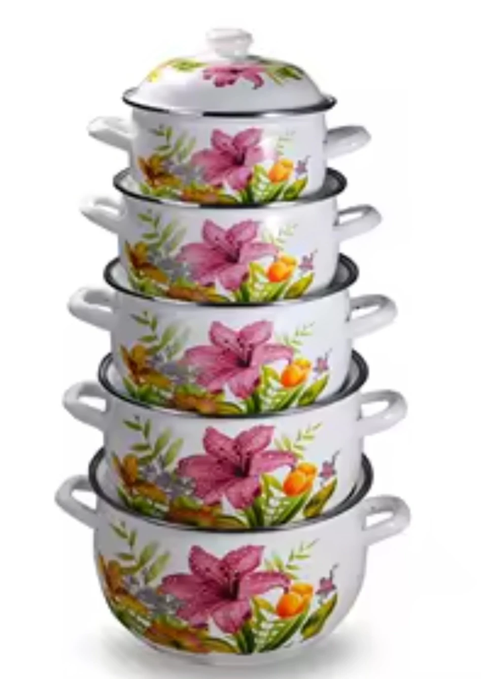 Tidal TD-9797 10 db Lábas edénykészlet Zománcozott fedővel, Virágmintás, 18-20-22-24-26 cm átmérő